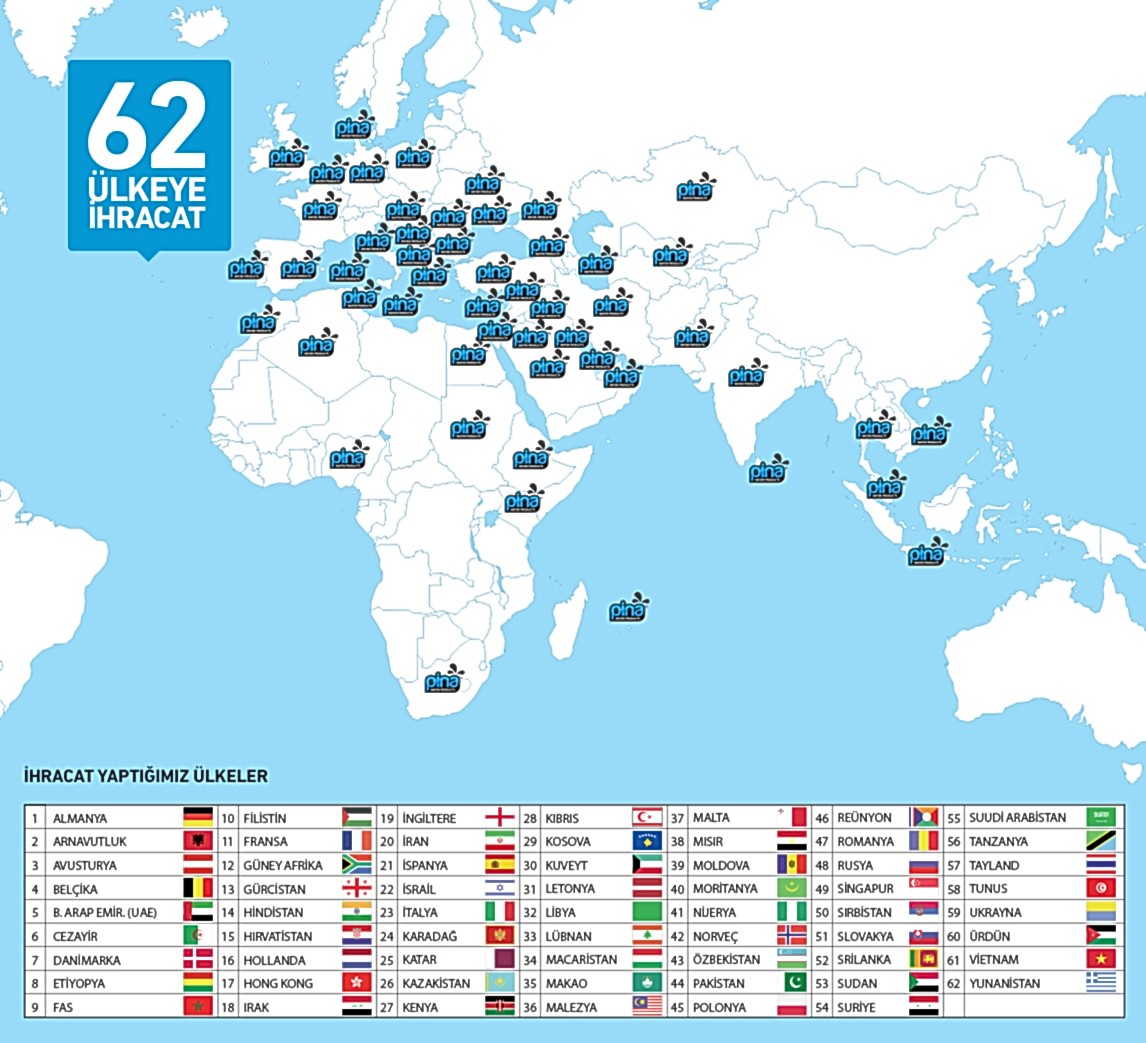 Dünyada hızla büyüyen PİNA, sektöründe üretimden taahhüte, ithalattan teknik servise tüm alanları tek çatı altında toplayarak hizmet ve ürün kalitesini sürekli yükselen bir ivmeyle artırmaktadır.