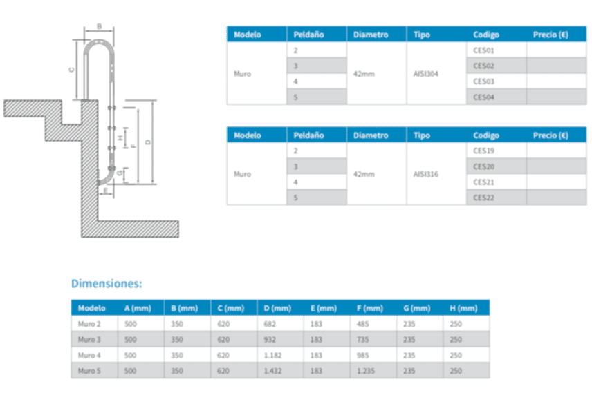 AISI 304 ve AISI 316 kalitede paslanmaz çelikten üretilen havuz merdiveni, paslanmaz basamakları, beton bağlantı parçaları ve lastik takozu ile birlikte taşma kanalından önce havuzun küpeştesine monte edilir.